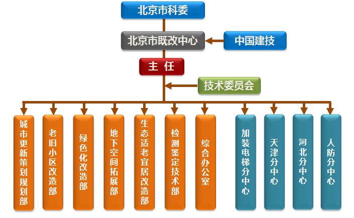 中心下设城市更新策划规划部、老旧小区改造部、绿色化改造部、地下空间拓展部、生态适老宜居改造部、检测鉴定技术部和综合办公室。为加强协调创新,中心整合京津冀行业优势资源,与北京筑福研究院、天津大学、中土大地公司、北京广源兴业科技发展有限公司联合成立了加装电梯分中心、天津分中心、河北分中心、人防分中心。