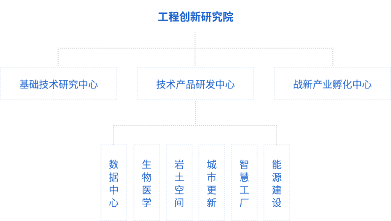 技术产品研发中心:在六个细分领域协助各部门从实际工作中挖掘有实用价值的创新点,综合分析判断有利方向后,加快推进该方向的试验、专利、论文、专著、工法、标准等研发过程中的必要成果,并在试用过程中不断纠错、调整,螺旋上升,形成可用可靠的应用型科技产品。