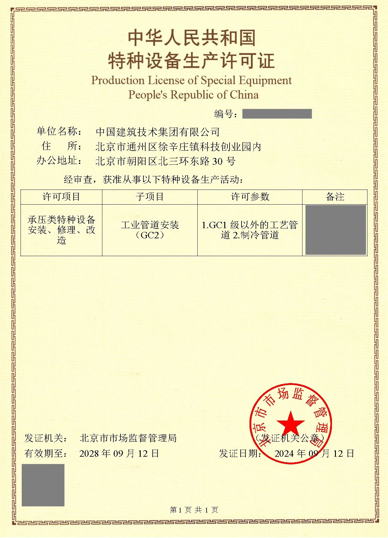 9月12日,经北京市市场监督管理局审核通过,中国建技成功取得“特种设备(GC2级工业管道安装)生产许可证”。工业管道安装(GC2级)生产许可证主要适用于承压类特种设备的安装、修理和改造。