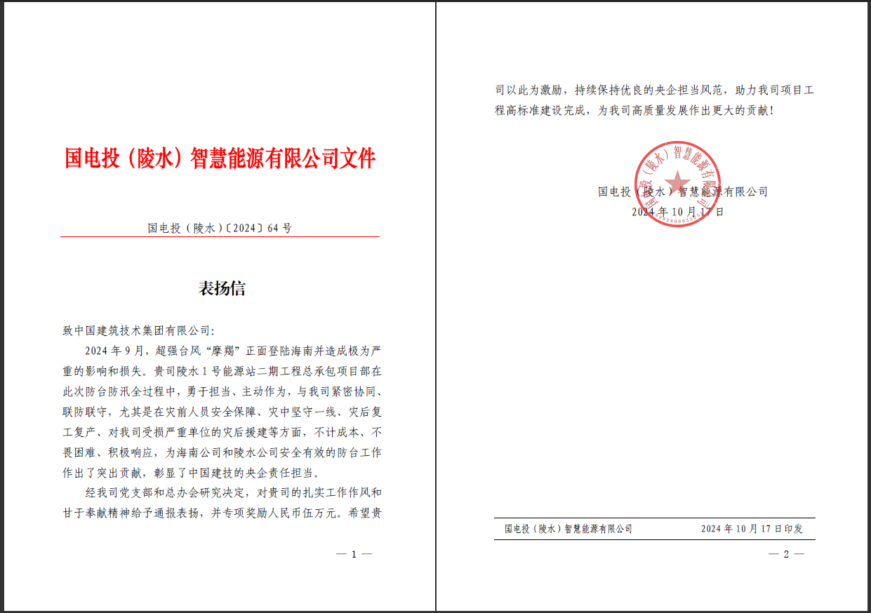 10月17日,中国建技收到国电投(陵水)智慧能源有限公司表扬信。对中国建技海南陵水1号能源站二期工程项目部在今年9月超强台风“摩羯”登陆海南期间,为防台工作作出的突出贡献给予通报表扬。