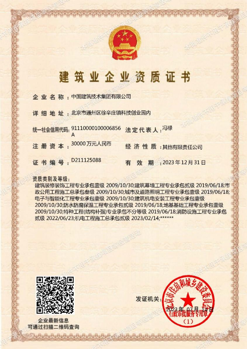 2月14日,经北京市住房和城乡建设委员会核准,集团公司申报的“机电工程施工总承包贰级资质”成功获批。