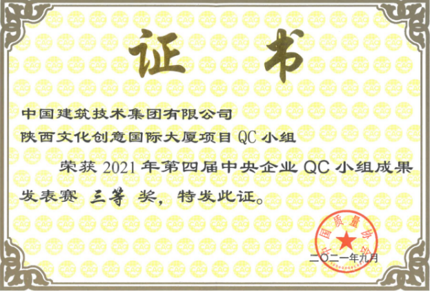 近日,由中国质量协会主办的第四届中央企业QC小组成果评选发表赛圆满结束。中国建筑技术集团有限公司西北分公司凭借陕西文化创意国际大厦项目QC小组《提高叠合板安装合格率》课题荣获三等奖。