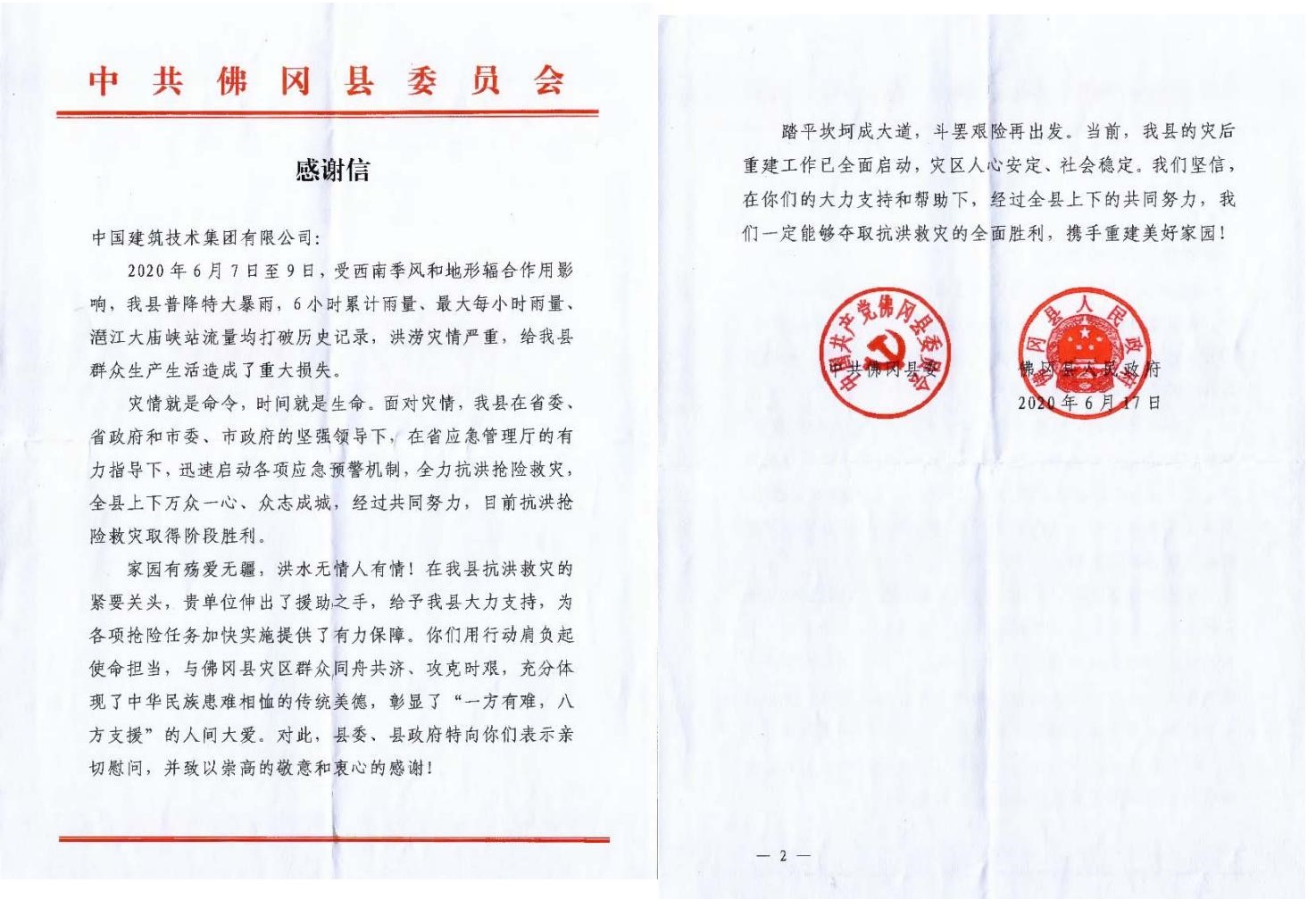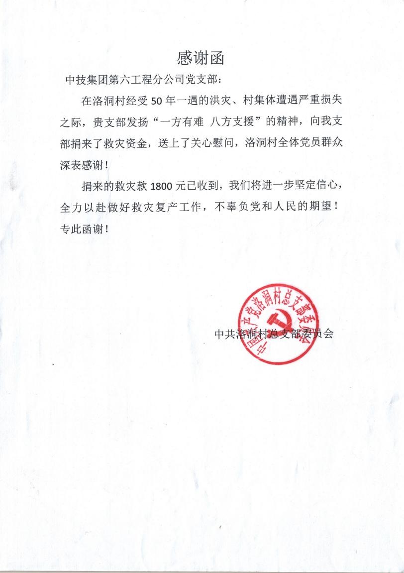 6月17日、6月23日第六工程分公司清远恒大御泉四季花园总承包项目部及第六工程分公司党支部接连收到了清远市中共佛冈县委、佛冈县人民政府、中共洛洞村总支部委员会的感谢信,感谢信内容主要是针对中技集团清远恒大御泉四季花园总承包项目部及第六工程分公司党支部在6月7日至6月9日清远市佛冈县发生的50年一遇的洪灾中做出的巨大贡献表示真诚的感谢。