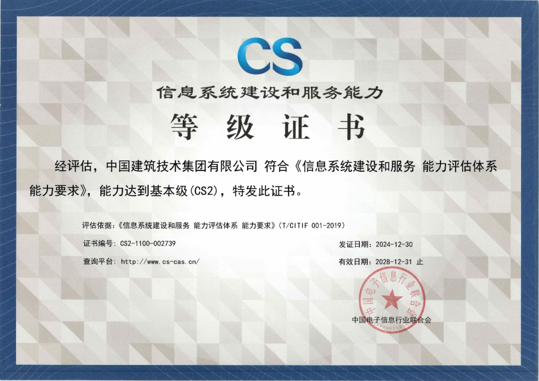此次CS2认证的获得,是对中国建技在信息系统建设和服务领域专业实力的肯定。中国建技将以此为基础,在数字化、智能化方面持续发力,持续输出“智筑美丽城乡”信息化解决方案,进一步提升企业数字化、信息化体系建设水平,助力各行业数字化转型升级,为推动建筑行业数字化转型高质量发展贡献央企智慧与力量。