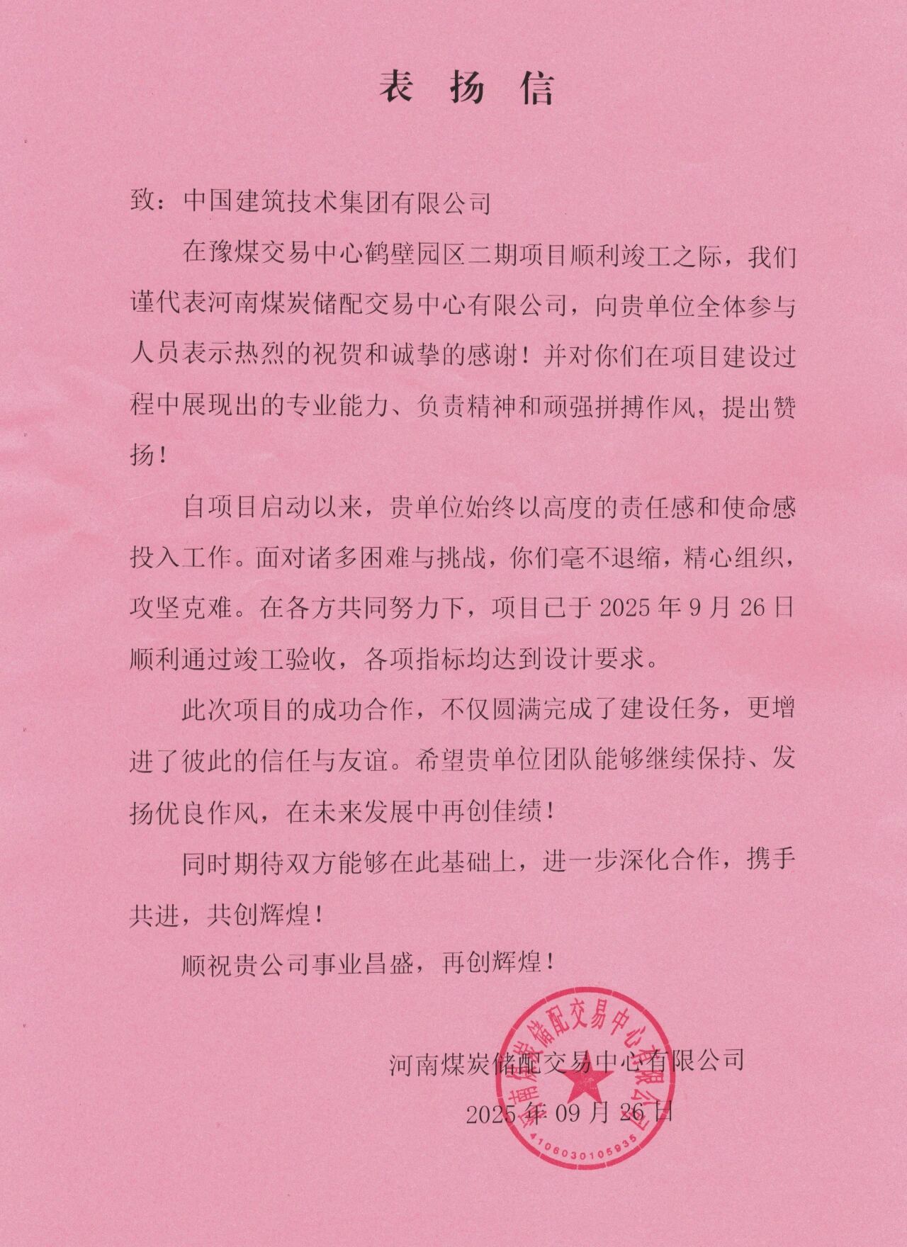 9月26日,由中国建技承建的河南省重点工程——豫煤交易中心鹤壁园区二期项目顺利通过竣工验收并正式投运。本项目于2023年11月25日启动建设,2025年5月31日竣工。