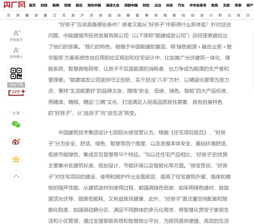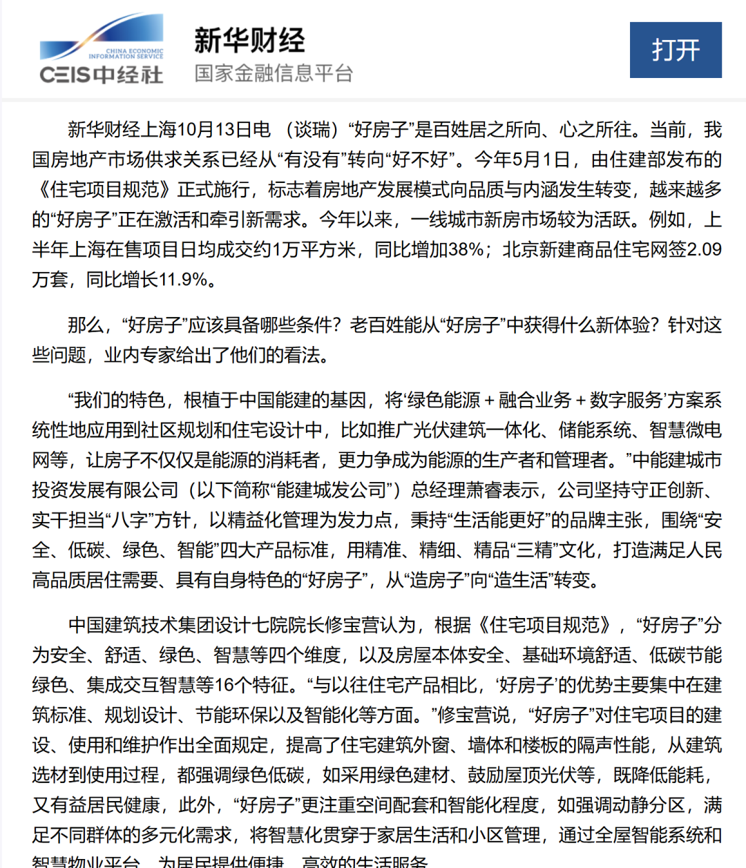 近日,“好房子”建设成为行业关注焦点——中国建技与中国能源建设股份有限公司(以下简称“中国能建”)在“好房子”领域的探索与实践,获新华财经、央广网、国资委官网、《中国证券报》等主流媒体高频报道。多层次、立体化的传播矩阵不仅让相关话题迅速破圈,单条报道最高阅读量更突破130万,充分彰显两家企业在“好房子”建设中的行业引领力,也印证了“好房子”理念与百姓宜居宜业需求的深度契合。