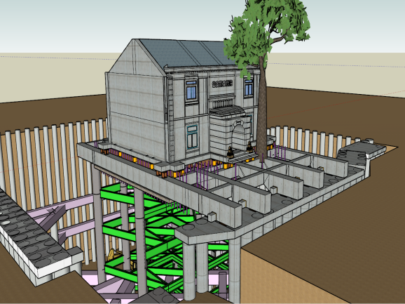 该建筑原为公安部办公楼,始建于民国时期,是西城区重点保护文物。建筑占地面积约400平方米,东西长约15米,南北长约14米,地上两层,地下基坑深度达20米。在该地块开发过程中,需在建筑周边及下方进行基坑开挖,同时西侧地铁19号线太平桥站B口的施工也在同步进行。为确保历史建筑的安全,项目团队对其进行了原址托换处理。