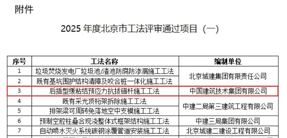 近日,由中国建技申报的“后插型缓粘结预应力抗拔锚杆施工工法”通过了北京市住房和城乡建设委员会组织的北京市工法专家评审,这一成果标志着中国建技在技术创新、施工质量和项目管理等方面实现了新的突破。