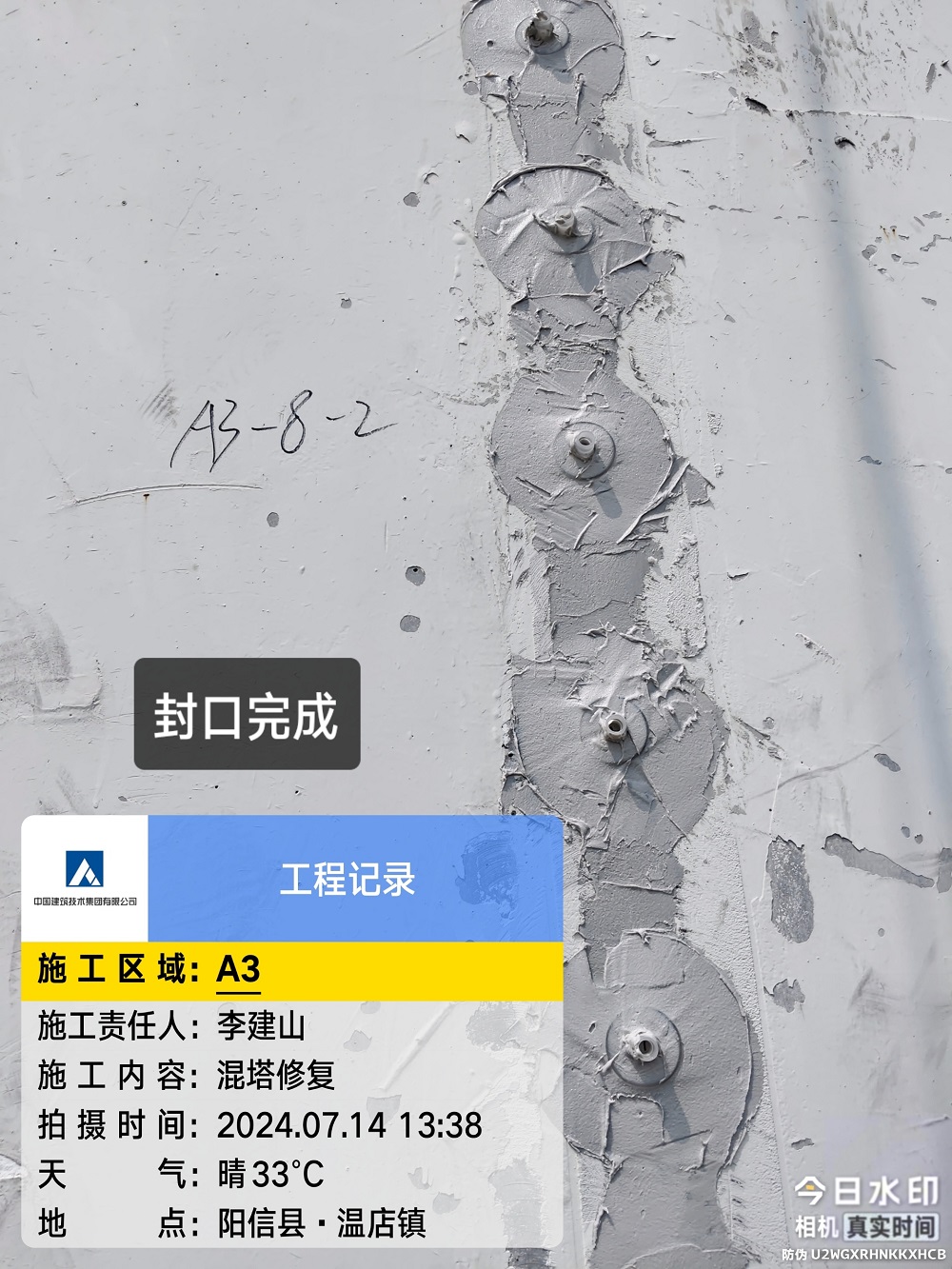 山东省德州市的中广核庆云尚堂风电场位于山东省德州市庆云县尚堂镇。WD195-5000型风电机组,混凝土部分为预制装配式结构,混塔总高110.03m,共28层。M01~M26高3.99m,M27高3.60m,M28高2.4m。M01~M07外径7800mm,M09~M14外径6600mm,M16~M28外径5400mm,M08、M15为过度节段。除门洞位置外,M01管片壁厚为300mm,M02~M27管片底部壁厚300mm,M28管片底部壁厚1050mm。M01~M15各由两个C型管片组成,通过竖缝插筋连接并灌浆,组成完整O型管片。管片M16~M28为完整的预制O型管片。我单位需对塔筒节间缝隙重新补胶,并对个别塔进行空鼓、掉块及裂缝进行修复。
