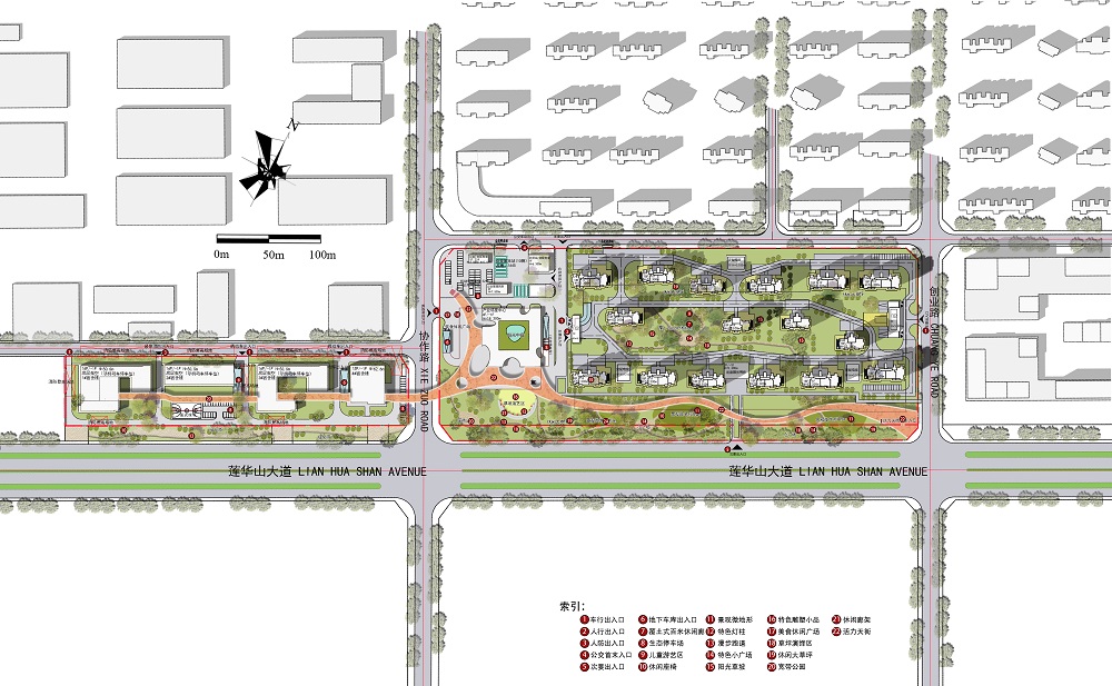 通过调研分析,提出【都市绿洲、活力天街、灵动空间】三个设计理念,着力打造五大特色场景: