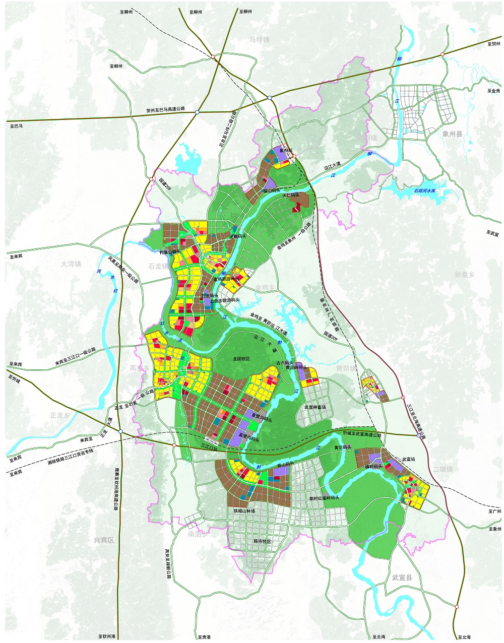 高效综合交通系统规划——以区域性交通互联互通为突破点,形成以港口、铁路、公路为核心的多式联运对外综合交通体系,强化以港口码头为中心建设通往柳州、河池等周边城市以及通往粤港澳大湾区城市的黄金水道;重点推进三江口新区产业组团与国道209、国道355等区域性交通干道的衔接;完善以港区港口为支点的港产城融合发展体系:加快石龙码头、直壁沟码头、黄泥岭码头及其配套设施的建设,以港口为依托,完善集疏运体系,促进港口与腹地经济良性循环发展,驱动新区从“码头经济”走向港产城融合发展。