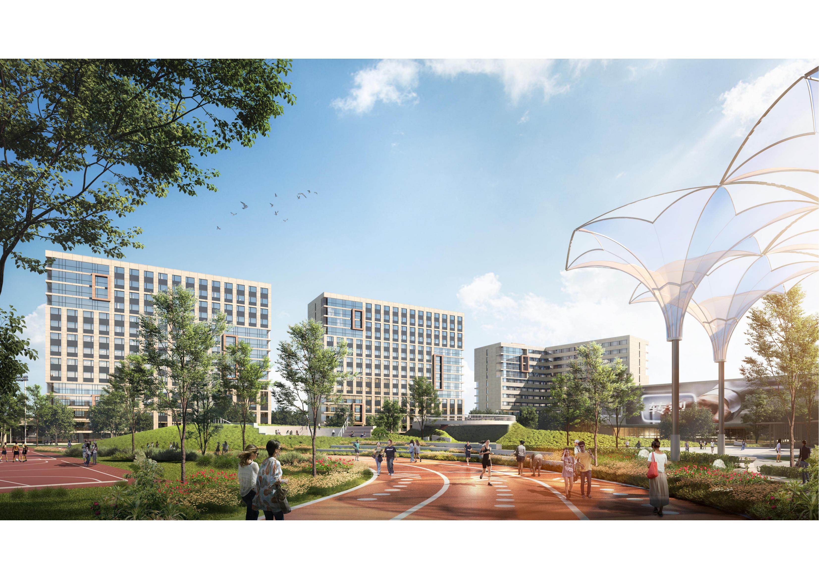 生活区景观以“玉如意”为意向,勾勒出学生活动场地、体育运动场地、集会休闲场地等形象,连接东西地块,营造了活泼怡人的生活氛围。