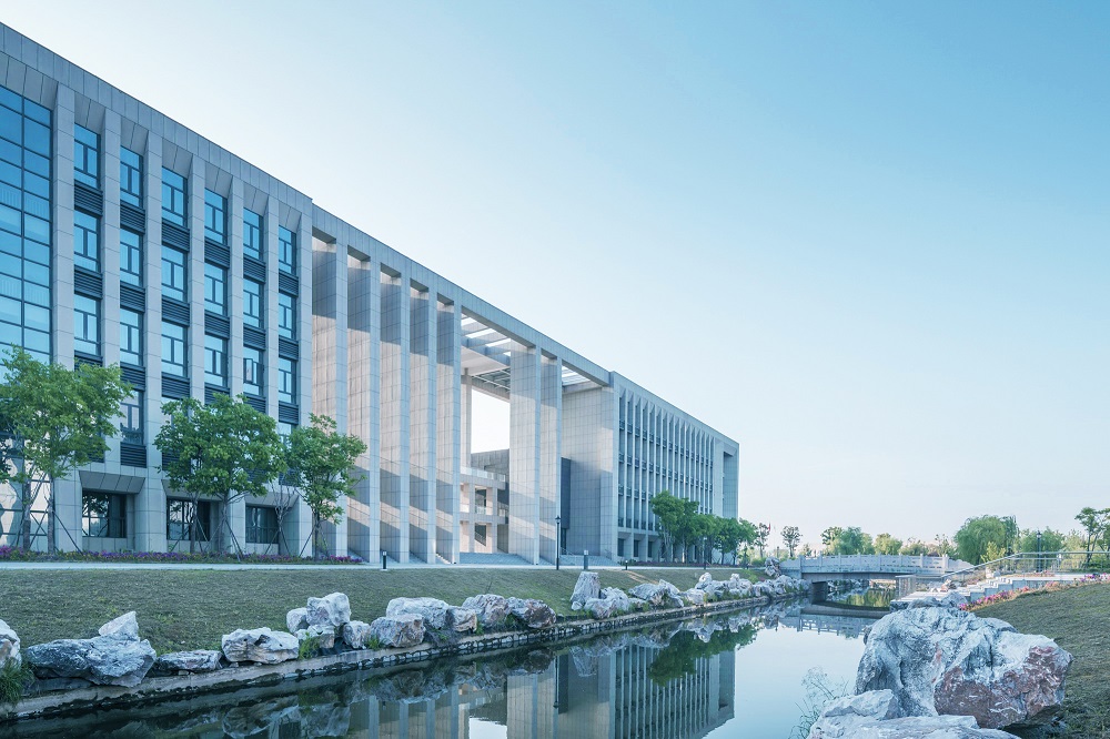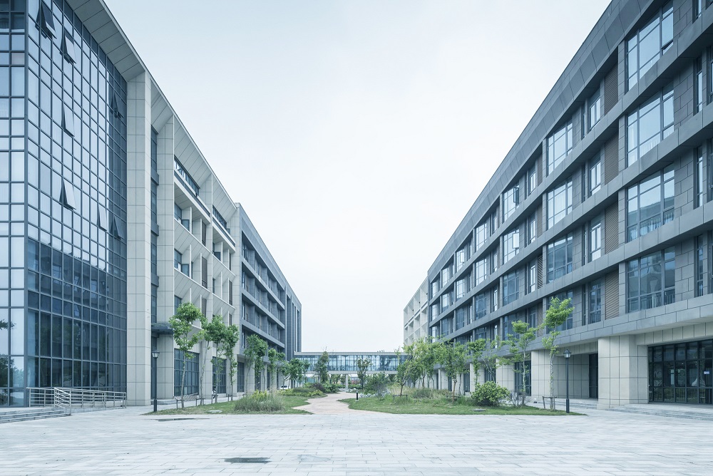 建筑设计秉承传承与创新的核心理念。研究高等教育起源校园规划手法与东西方校园开放空间策略,奠定校园核心区域教学区、实训区基调。教学区严谨庄重,打造轴线分明的共享空间,视为传承;实训区流动拓展,打造平等、自由、交流、学习的氛围,视为创新。结合江苏泰州当地建筑颜色与现代校园色彩体系,体系校园的文化与严谨。