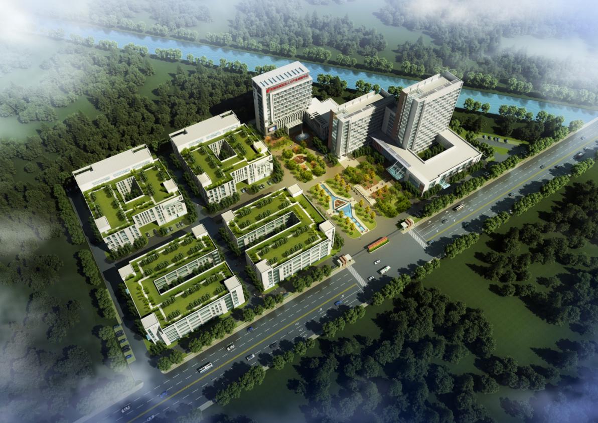 科技园区主入口设置在衡山路的中段,研发办公和厂房建筑(1#2#3#4#厂房)分设主入口两边,同时形成了主入口广场:中央广场布置流通环绕的景观水体,暗合高科技产业“智者近水”的主题。