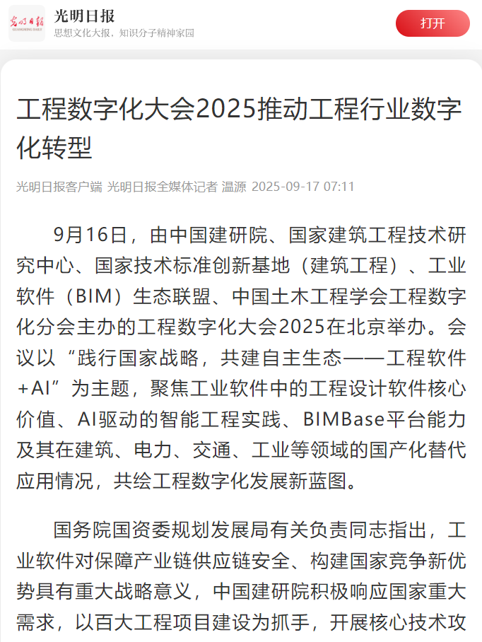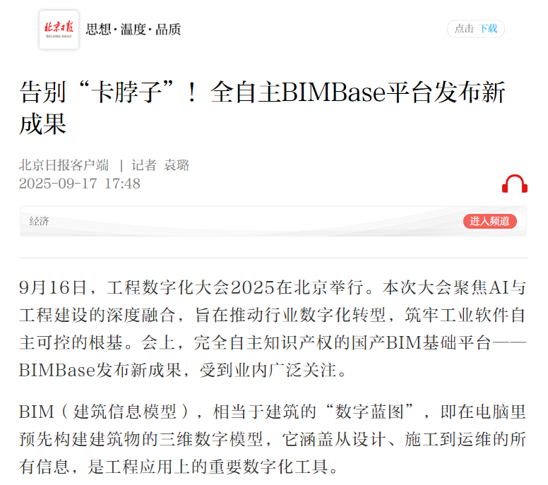 北京日报对工程数字化大会2025发布成果进行详细介绍,提出面对国内工业软件领域长期依赖国外技术、缺乏统一平台等痛点,BIMBase作为国产自主平台,正在逐步改变这一局面,目前已在实际工程中应用与推广。