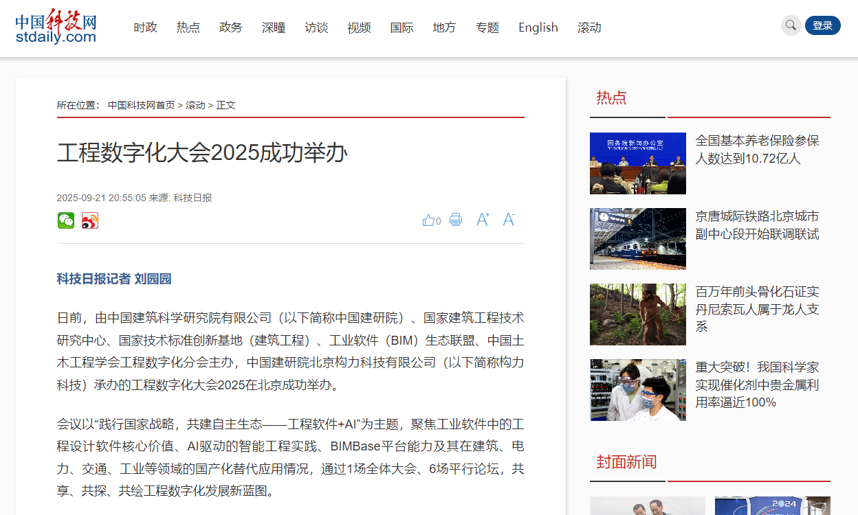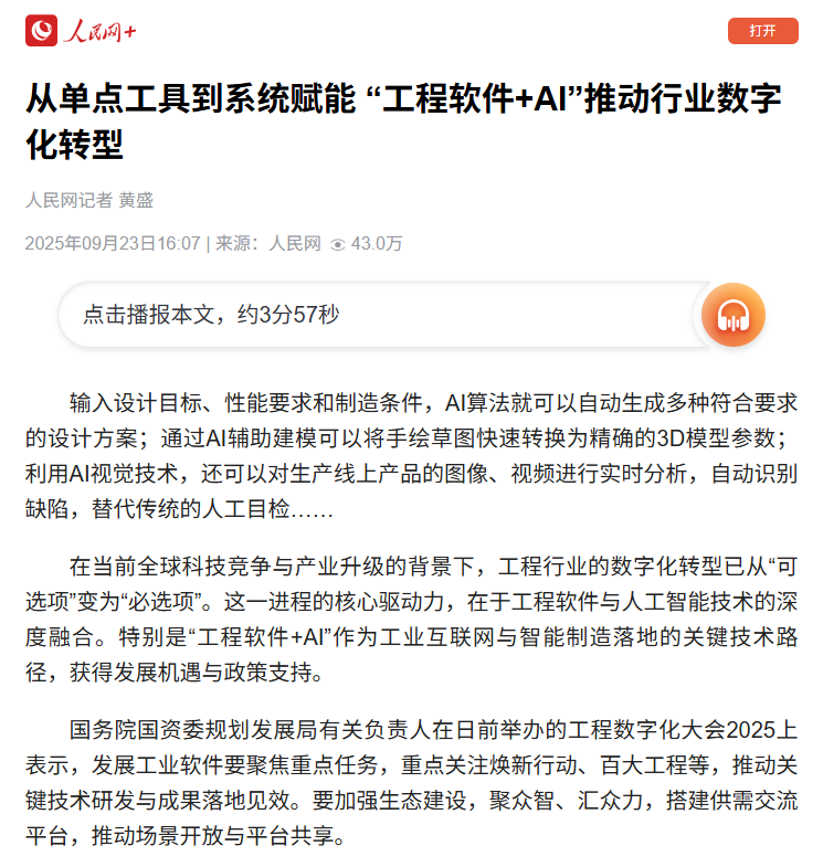 人民网以“工业软件+AI”角度为切入口,报道工程数字化大会2025相关成果,突出中国建研院从单点工具到系统赋能“工程软件+AI”的经验做法,并针对电网、交通领域相关实践的成果和成效进行报道。