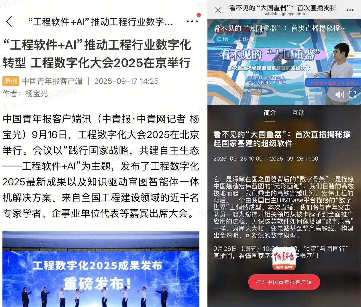 中国青年报结合实际报道工程数字化大会2025发布的成果以及知识驱动审图智能体一体机解决方案,并在大会后以直播形式报道构力科技展厅和BIM系列成果。