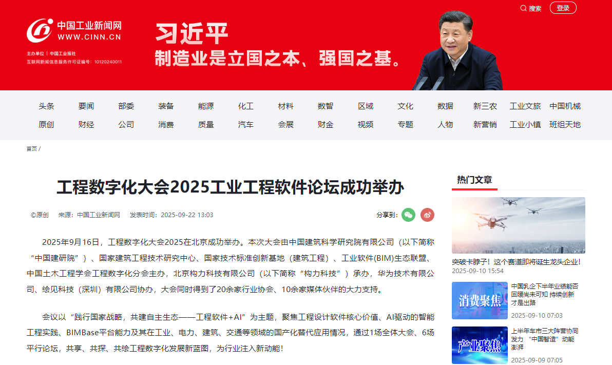 9月16日,工程数字化大会2025在北京成功举办。人民网、人民日报新安全、光明日报、科技日报、工人日报、中国青年报、北京日报、建筑杂志社、中国工业报、中国能源新闻网、中国化工报等10余家权威媒体对会议进行了深度报道。