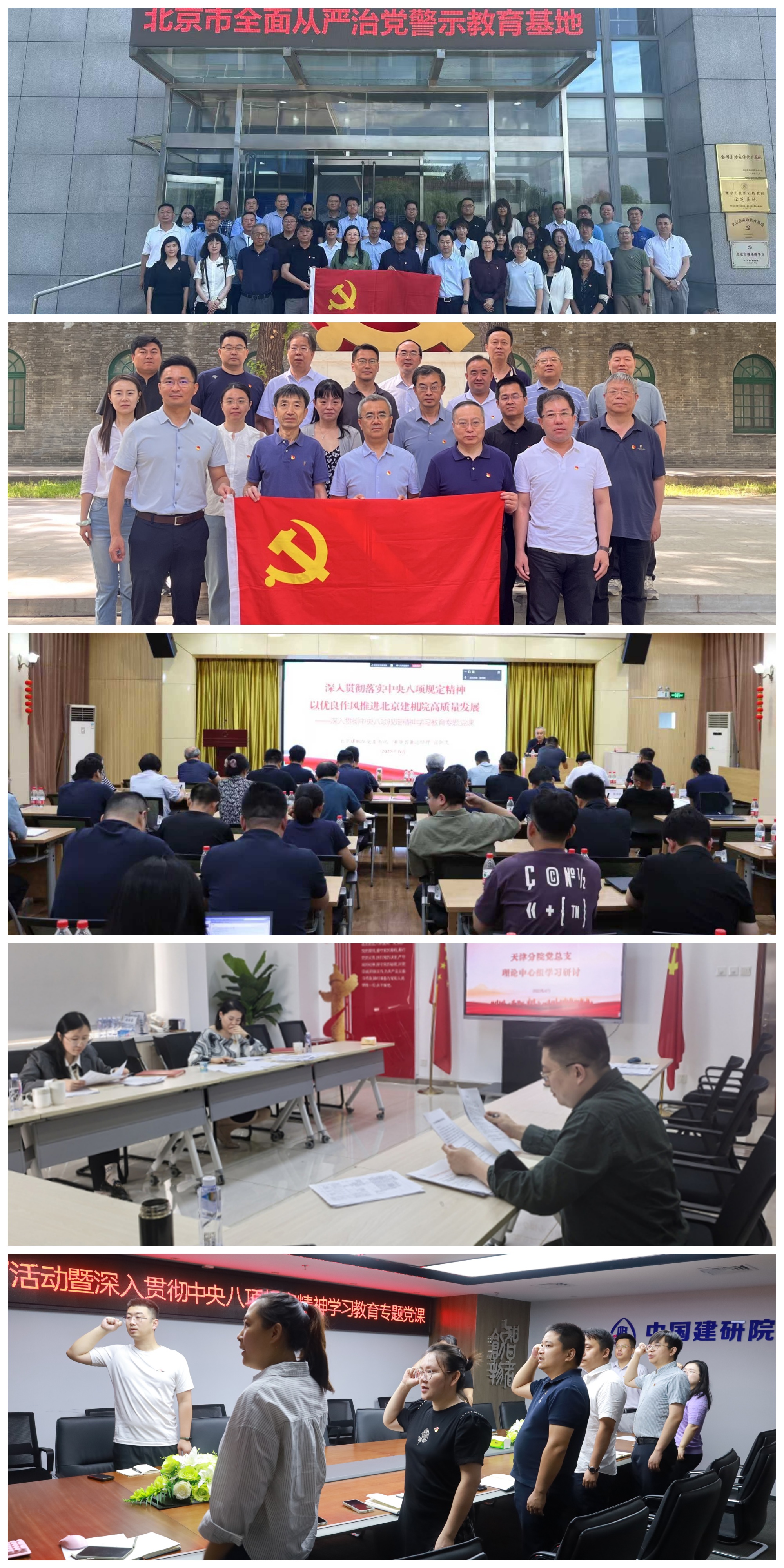 中建研科技党委联合纪委开展“警钟长鸣守初心 廉洁担当践使命”活动,组织党员干部赴八宝山革命公墓党员干部政德教育基地、北京市全面从严治党警示教育基地开展警示教育,引导党员干部强化思想认识,增强拒腐防变能力。建研地基党委将中央八项规定及其实施细则精神作为理论学习中心组学习的“必修课”,引导所属各党支部通过“三会一课”、主题党日等形式开展学习教育,强化理论武装。北京建机院党委领导班子成员充分发挥示范带动作用,全面深入联系单位、分管部门、基层党支部等讲授专题党课,回顾党的作风建设的历史脉络与党内教育实践宝贵经验,剖析违反中央八项规定精神典型问题,推动作风建设常态化长效化。天津分院党总支高标准高质量开展学习教育,党总支及所属党支部以“集中学习+专题研讨+个人研学”的方式开展学习研讨、党课宣讲、警示教育,推动学习研讨向“神经末梢”延伸。热带院党支部加强传达学习、统筹谋划和组织领导,及时学习贯彻教育有关文件精神,常态化开展党课、主题党日等活动,引导党员干部从思想源头上筑牢“不敢腐、不能腐、不想腐”的廉洁自律防线。