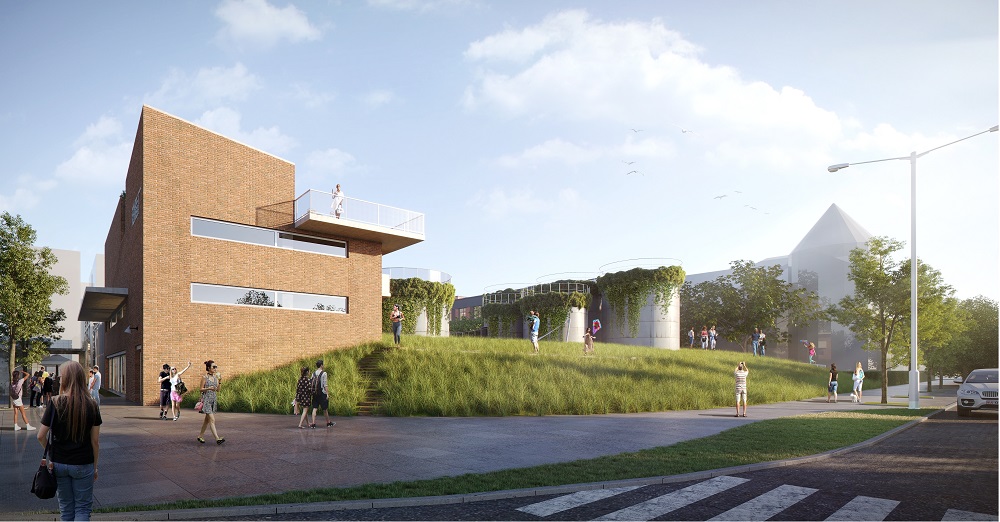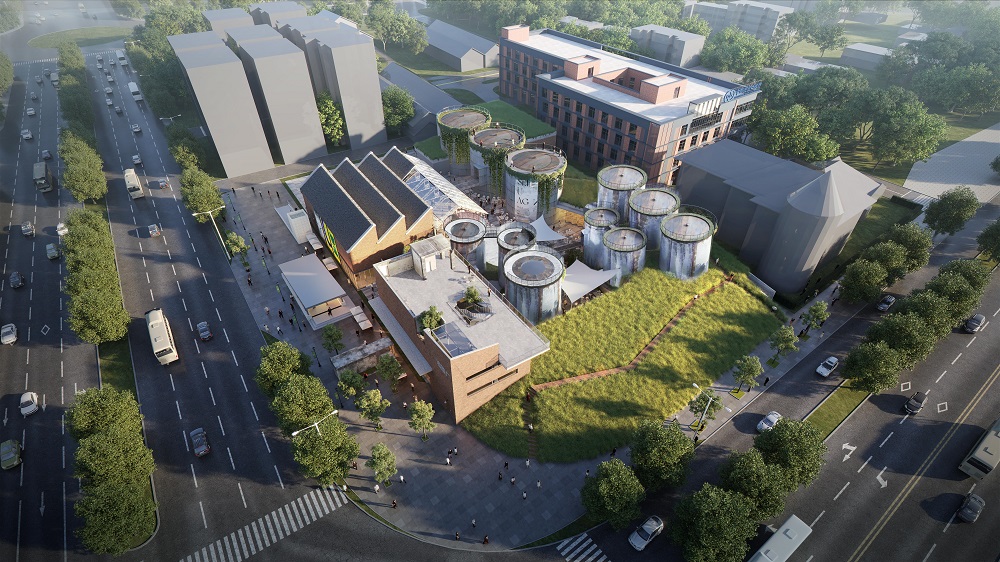 显性的保留是指设计最大程度的保留了场地的原始肌理,尊重市民和历史,保留城市核心区域的工业遗存。一是保留了绝大多数油罐,二是原本街角的业务楼和东侧厂房两个主要建筑维持在原来的位置。业务楼通过减层降低了建筑高度,东侧厂房由于已经鉴定为危楼,在拆除后进行了原址复建。