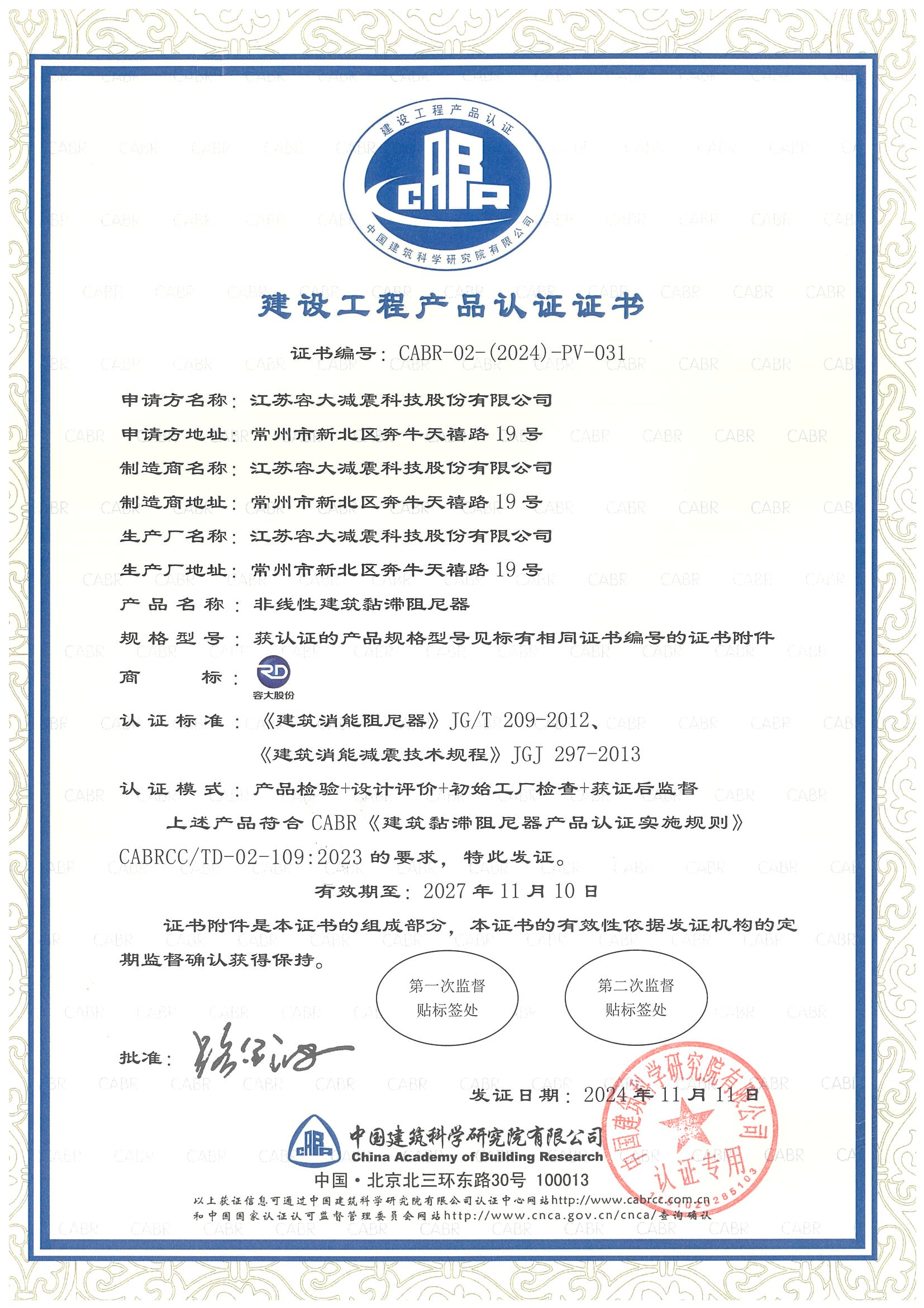 江苏容大减震科技股份有限公司作为我国减震产品市场的头部企业之一,已于 2024 年 11 月获得 CABR 建筑粘滞阻尼器产品认证,荣膺国内首家获此权威 “质量背书” 的企业。