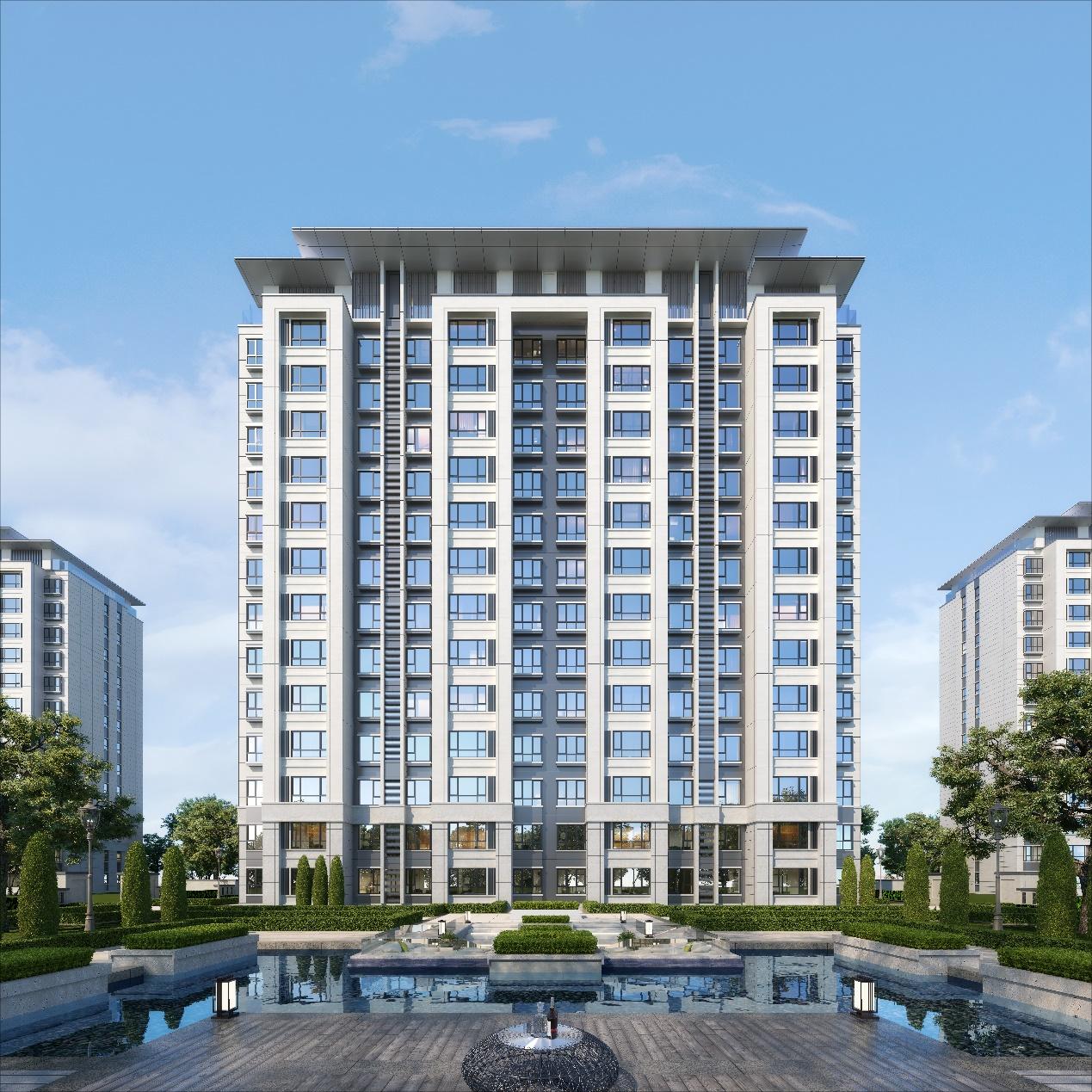 项目采取住宅建筑立面公建化,通过使用石材、金属线脚,与玻璃窗形成强烈材质对比,展示上下层窗间墙细部刻画形成优美的韵律;首层二层均采用米白色石材,建筑主体采用米白色高档仿石涂料,细部线脚采用深色金属线脚,顶部格栅采用浅色金属格栅,窗框及空调机位百叶采用深灰色金属材质,大气稳重不失于变化。