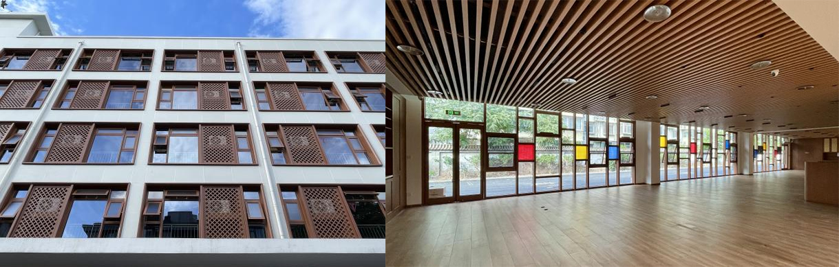 建筑改造难点:改造前建筑首层为仓库,二至五层为配套用房。根据老年人照料设施的各项要求,增设消防电梯并改动楼梯位置以满足消防疏散的要求。项目首层进深大、采光差,改造中合理组织功能,改造中部采光不佳的空间,将原有井字梁保留,拆除顶板,设置锥形天窗,引入自然光和自然通风,使原本昏暗的空间变得充满生机;同时围绕主空间,合理布置各类功能空间。二至五层选择合理位置设公共起居室,老人居室门局部后退,同时交错布置,让单调的走廊空间富于变化。二至五层层高仅3.15米,原结构形式为井字梁,建筑空间结合井字梁位置布局,除走廊外不设吊顶,尽量保证舒适的空间尺度。走廊部分与机电专业协作,合理布置管道,避免排烟主管穿越主梁下方空间,保证净空高度满足疏散要求;机电设计尽量利用原有系统,减少改动量,控制造价。因项目位于城市中心区,与南侧居民楼距离不足20米,外立面利用原有结构框架,采用标准窗单元及保温复合一体板,保证建成效果的同时避免复杂施工对周边居民造成的干扰。