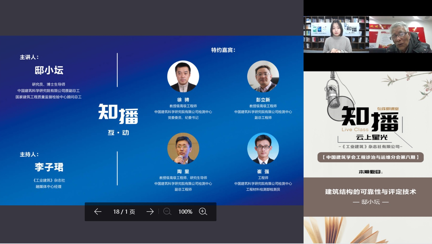 根据中国建筑学会工程诊治与运维分会筹备工作安排,检测中心顾问总工、研究员邸小坛于3月4日晚作题为《建筑结构的可靠性与评定技术》的讲座,4200余名观众通过网络直播观看讲座。检测中心教授级高工徐骋,副总工彭立新、陶里,青年技术骨干崔强作为特邀嘉宾参加讲座并作交流报告。