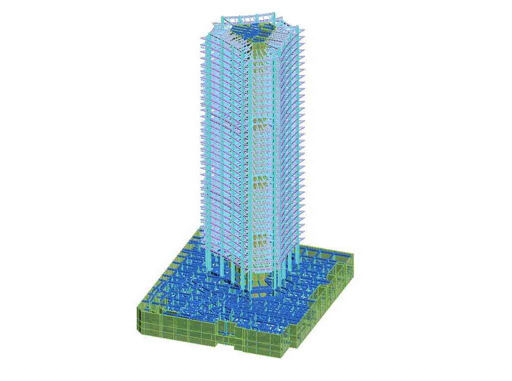本项目主楼地上34层,结构高度近150米,结构体系采用钢管混凝土柱钢框架-钢筋混凝土核心筒结构,抗震设防烈度为8度,抗震性能目标为弱C级。