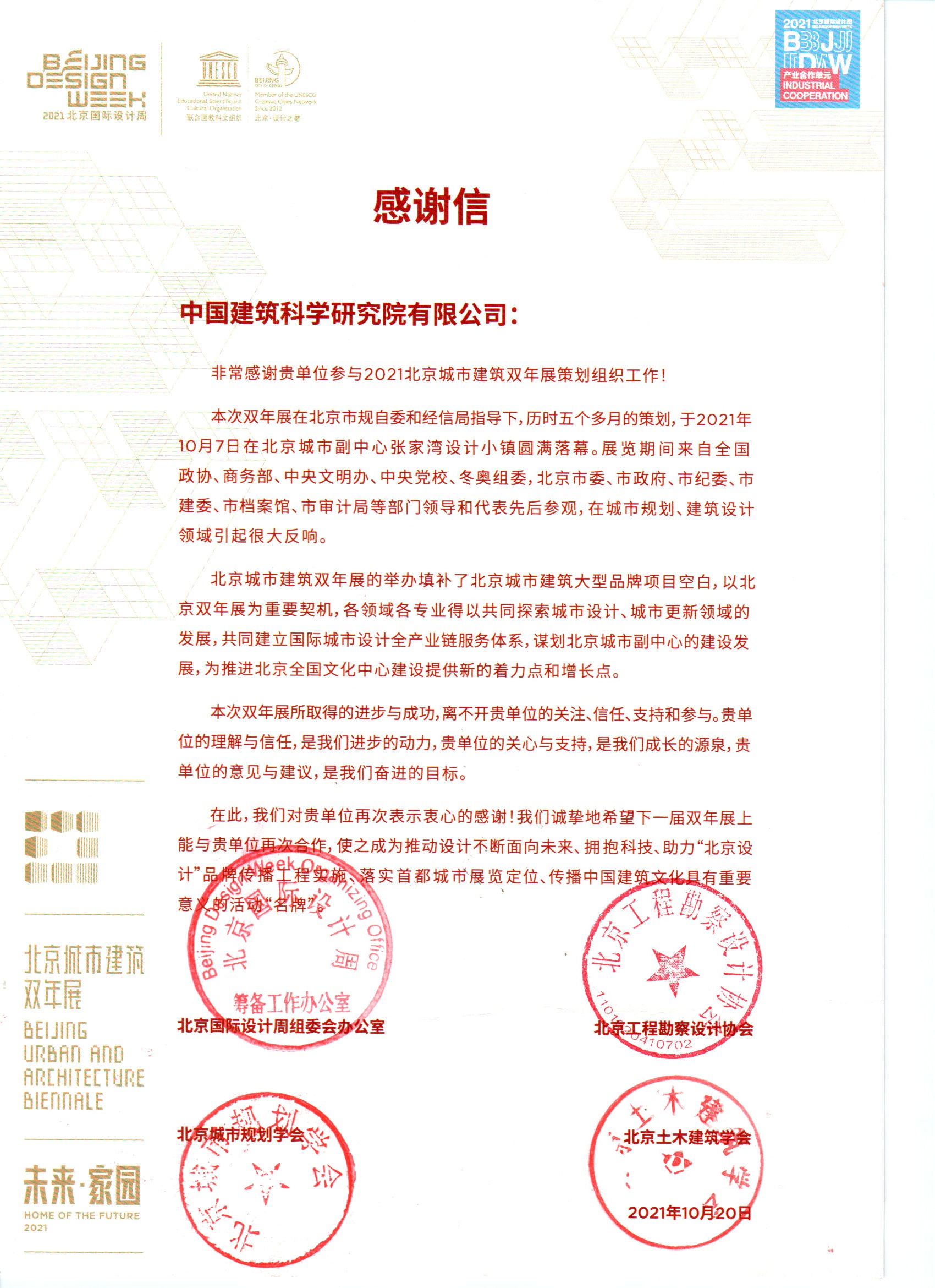 10月25日,公司收到北京国际设计周组委会办公室、北京工程勘察设计协会、北京城市规划学会、北京土木建筑学会联合发来的感谢信,感谢公司参与2021北京城市建筑双年展的策划组织工作。