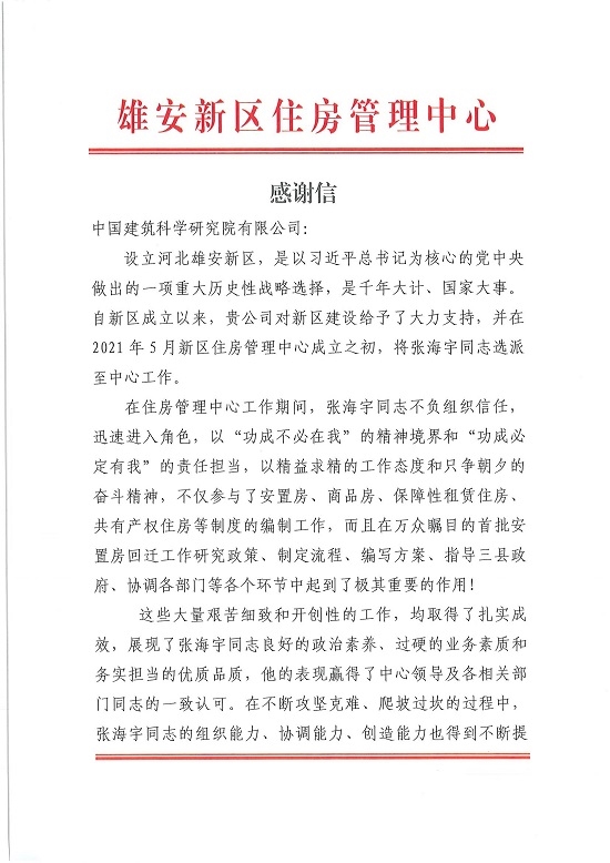 建筑设计院于2021年5月选派张海宇同志到雄安新区住房管理中心工作。该同志参与了安置房、商品房、保障性租赁住房、共有产权住房等制度的编制工作,并在首批安置房回迁工作研究政策、制定流程、编写方案、指导三县政府、协调各部门等各个环节中起到了重要作用,展现了良好的政治素养、过硬的业务素质和务实担当的优质品质。下一步,建筑设计院将一如既往地关注、支持雄安新区的建设工作,持续为雄安新区高质量建设发展贡献新的更大力量。