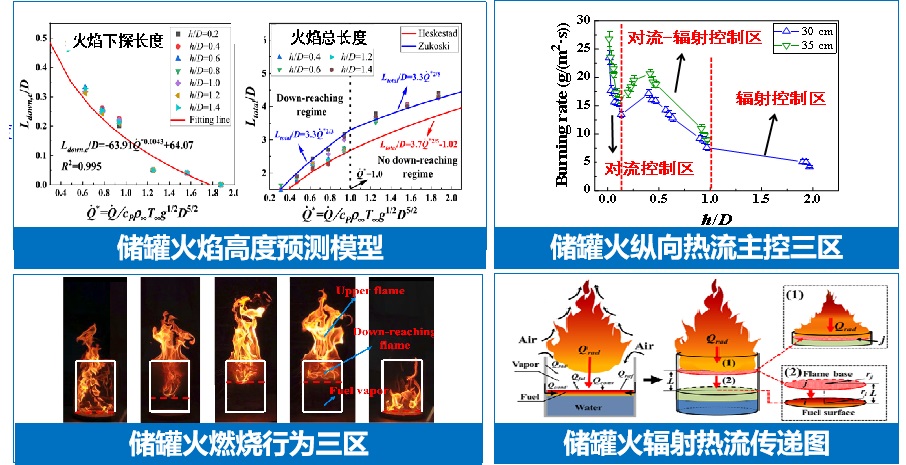 搭建了缩尺度、实体储罐火灾实验平台,明确了不同液位高度下的储罐火关键燃烧参数演变规律,构建了储罐火燃烧速率、火焰长度、火焰温度等数理表征模型,将油池火关键参数模型从二维(1959年Hottel模型)扩展至三维立体火灾模型,完善了储罐火灾动力学理论。