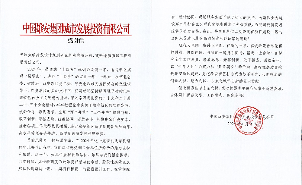 1月15日,建研地基收到中国雄安集团城市发展投资有限公司感谢信,对建研地基阶段性高效完成启动区创新坊一期、二期项目标段一的勘察设计工作表示感谢。