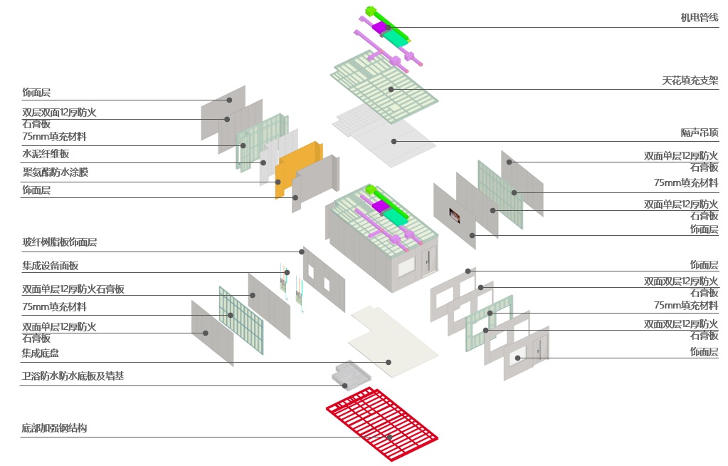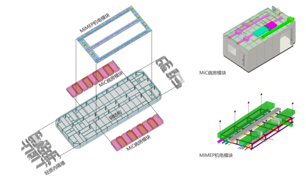 嵌入式MiC模块化病房集成了模块结构、机电和装修,对标先进制造业,旨在打造高度集成化、工业化的产品。在工厂采用数字化设备完成模块生产与安装,随后运输至现场快速组装,在大幅缩短工期的同时提升了建筑品质。
