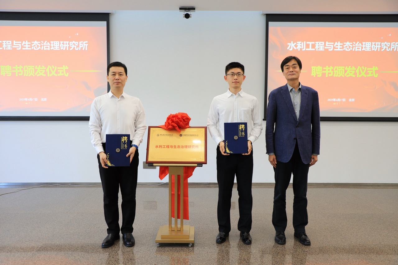 樊金龙、化建新、张冲共同为“水利工程与生态治理研究所”揭牌。李军为所长毛宗原、副所长韩凯颁发聘书。
