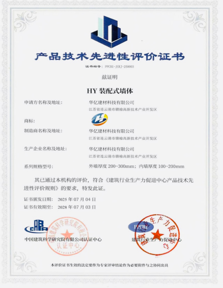 “装配式凝胶玻珠复合保温墙板(HY型)”是一种兼具优良保温性能和阻燃性能的创新产品,技术体系完整、工程适用性强,现已实现规模化生产。住房和城乡建设部科技与产业化发展中心出具的评估意见指出,该成果生产工艺合理、质量保证体系完备,适用于钢筋混凝土结构或钢结构建筑非承重外墙,具有推广应用价值。此前,由认证中心、建筑行业生产力促进中心组织行业专家对其开展的产品技术先进性评价结果也表明,该产品在保温性能、装配性能等方面达到行业较高水平,具备工程推广条件。