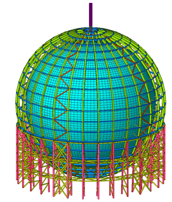 中建研科技自2014年起受中国科学院高能物理研究所委托,为这一国家重大科技基础设施提供关键技术支撑。用工程技术破解科学难题,是中建研科技在该项目中核心价值的集中体现。江门中微子实验建筑选址于广东江门开平市打石山地下700米处。核心探测器为有效质量达两万吨的液体闪烁体探测器(中心探测器)。直径41.1米的不锈钢网壳作为主支撑结构,承载了包括35.4米直径的有机玻璃球、两万吨液体闪烁体、两万只20英寸光电倍增管、两万五千只3英寸光电倍增管等众多关键部件。