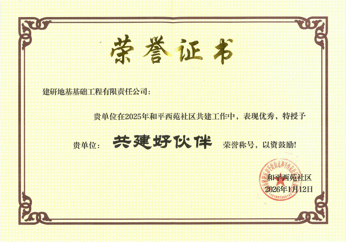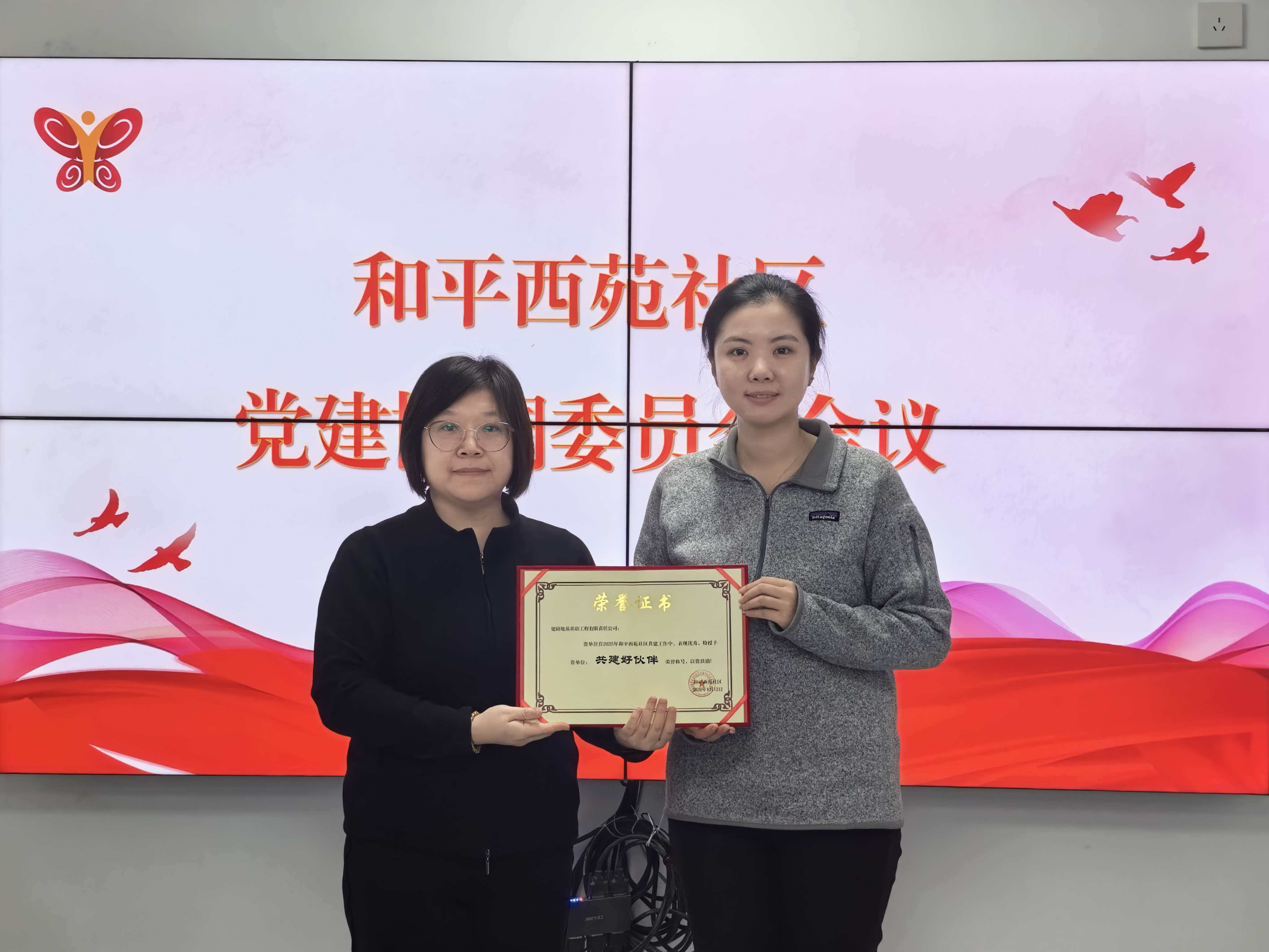 和平西苑社区对2025年度优秀共建单位予以表彰,建研地基荣膺“共建好伙伴”荣誉称号,这份荣誉既是对建研地基积极投身社区共建、深化社企融合发展的高度肯定,更是对企业主动履行社会责任的充分认可。