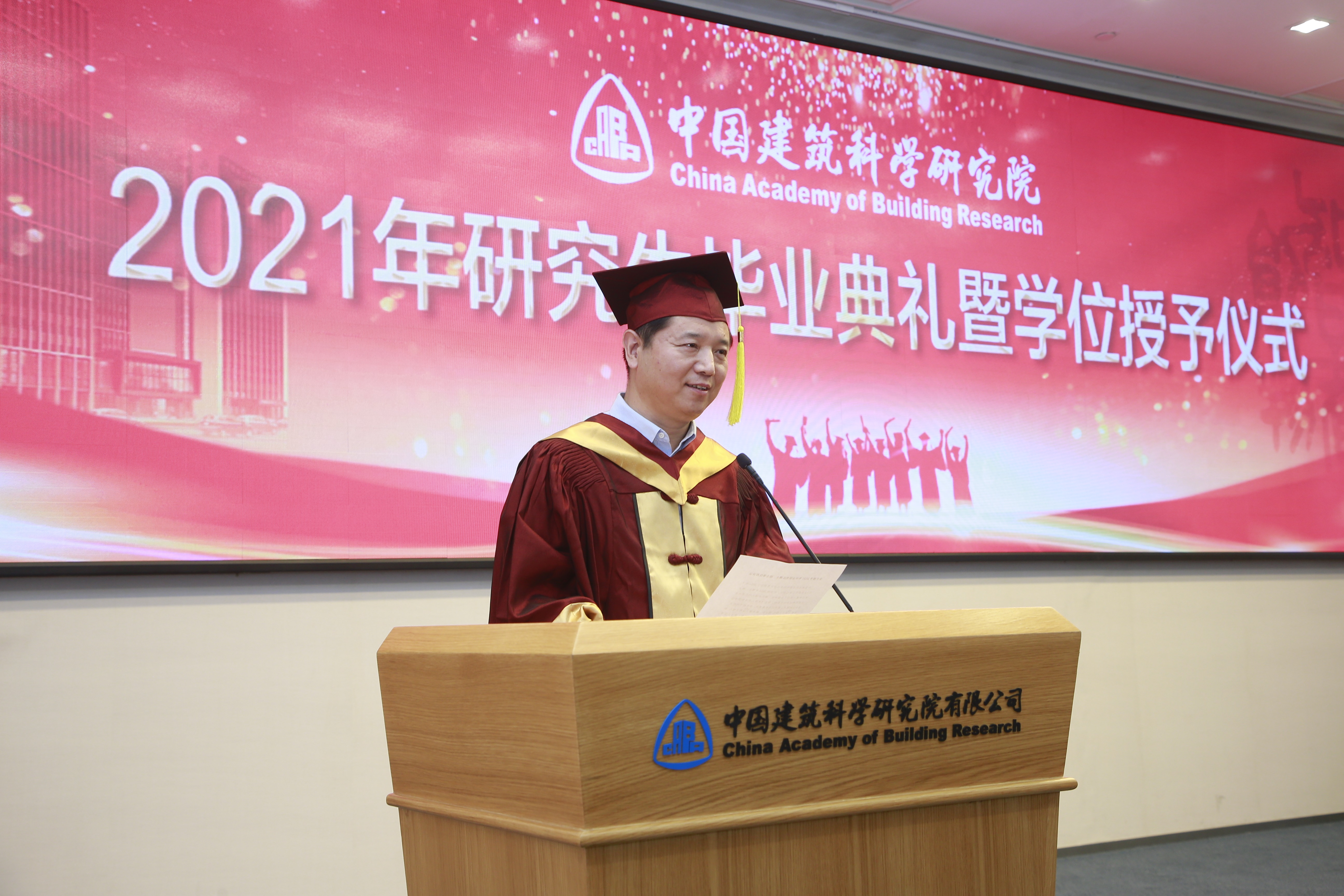 王清勤宣读了《中国建筑科学研究院关于授予2021年毕业研究生博士、硕士学位的决议》。王俊、王清勤分别为2021届毕业研究生和2020届毕业研究生代表逐一扶正流苏并颁发学位证书。
