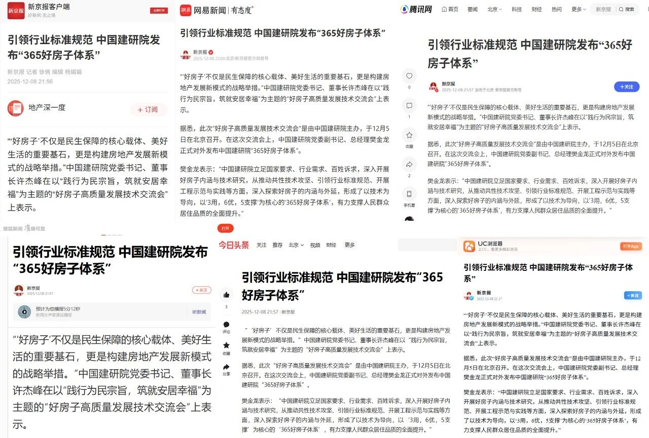 新京报从发布“365好房子体系”、“好房子”改造方案同步出炉等方面,对中国建研院引领行业标准规范成效进行多媒体、全方位的报道和展示,强调中国建研院此次发布的“365好房子体系”围绕“让人民群众安居幸福每一天”的核心愿景,聚焦解决行业痛点与百姓难点,系统构建了“3用、6优、5支撑”的完整框架与实施路径。