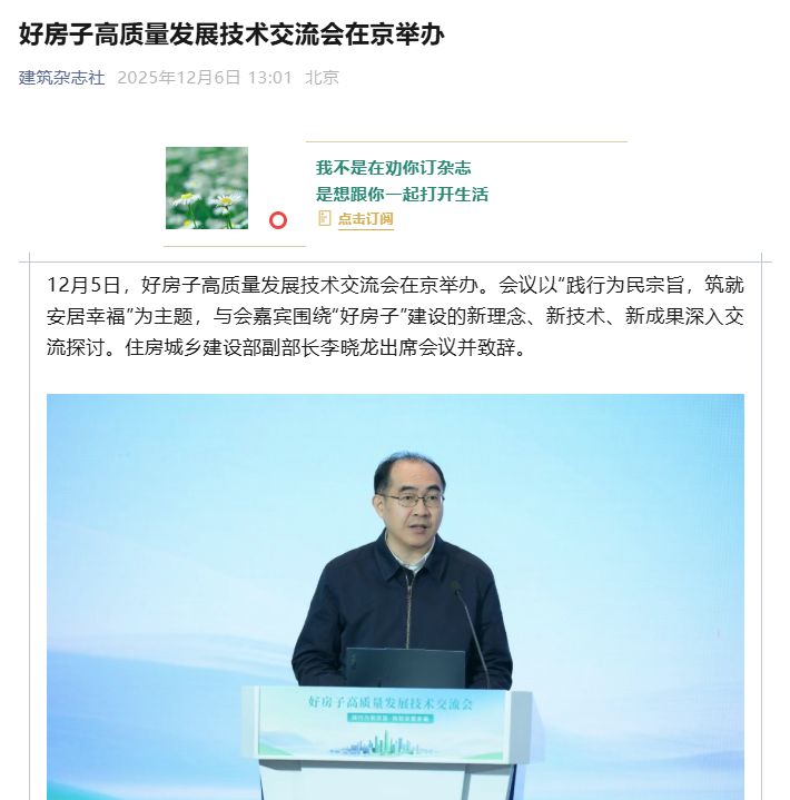 建筑杂志社报道了好房子高质量发展技术交流会,提出会议以“践行为民宗旨,筑就安居幸福”为主题,与会嘉宾围绕好房子建设的新理念、新技术、新成果深入交流探讨。住房城乡建设部副部长李晓龙出席会议并致辞。