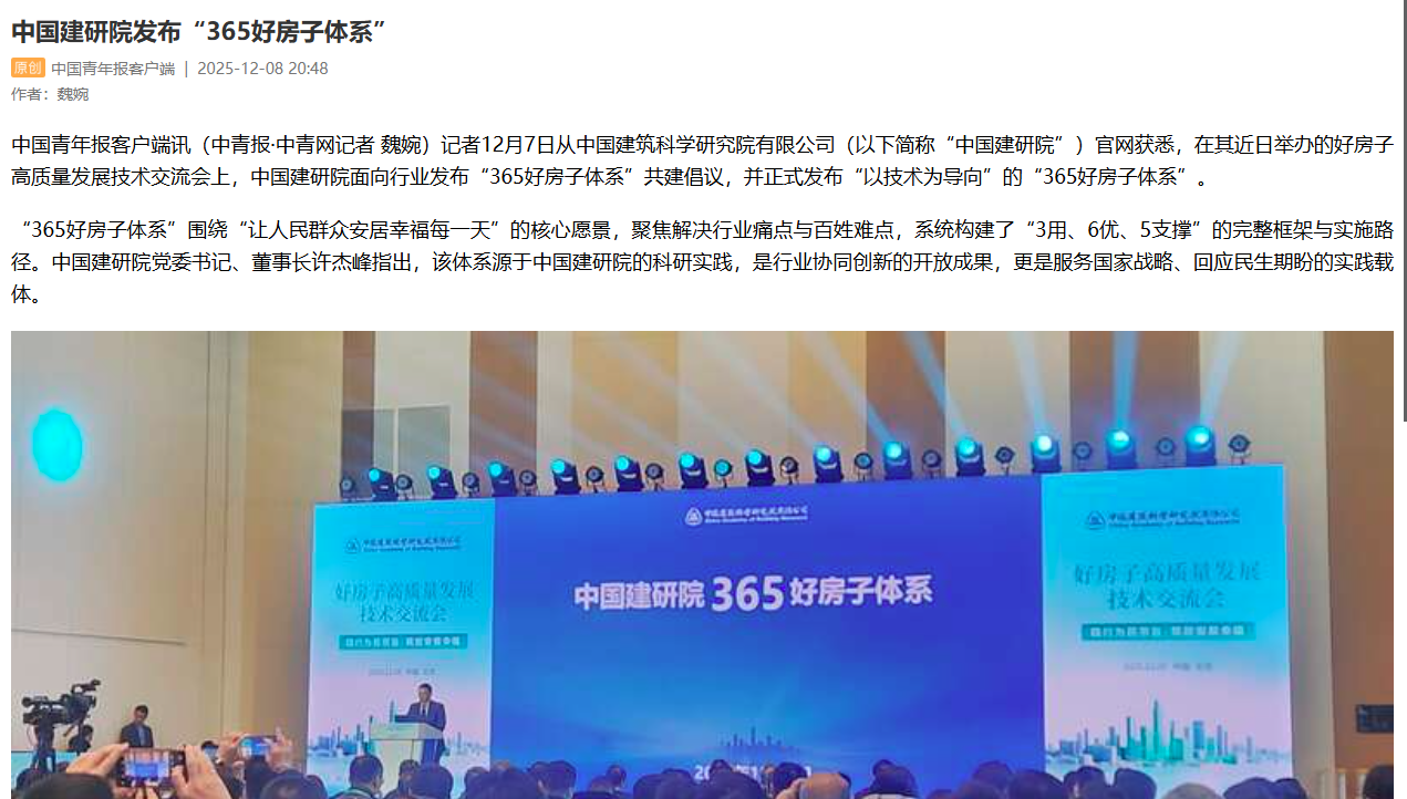 中国青年报对好房子高质量发展技术交流会上,中国建研院面向行业发布“365好房子体系”共建倡议,并正式发布“以技术为导向”的“365好房子体系”进行报道,强调“365好房子体系”围绕“让人民群众安居幸福每一天”的核心愿景,聚焦解决行业痛点与百姓难点,系统构建了“3用、6优、5支撑”的完整框架与实施路径。