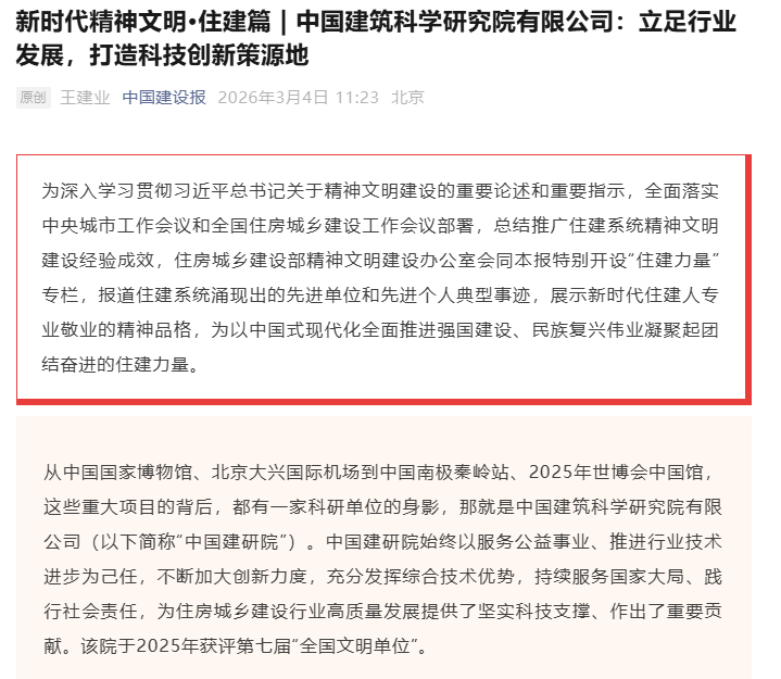 为深入学习贯彻习近平总书记关于精神文明建设的重要论述和重要指示,全面落实中央城市工作会议和全国住房城乡建设工作会议部署,总结推广住建系统精神文明建设经验成效,住房城乡建设部精神文明建设办公室会同中国建设报特别开设专栏,报道住建系统涌现出的先进单位典型事迹。本期《新时代精神文明•住建篇》专题报道中国建研院立足行业发展打造科技创新策源地的成效做法,展现新时代中国建研院人以中国式现代化全面推进强国建设、民族复兴伟业的精神品格与担当作为。