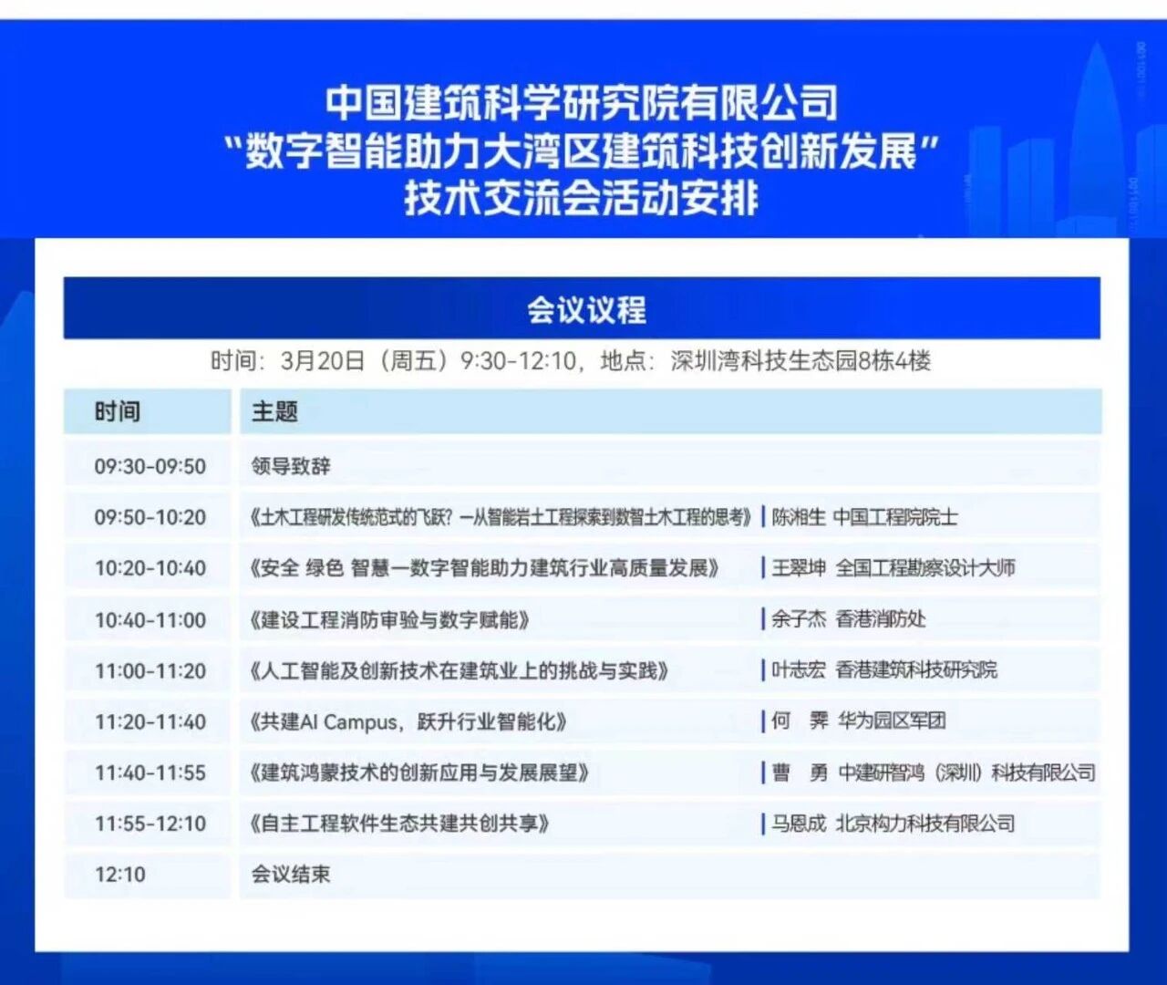 为贯彻落实国家区域协调发展战略,积极响应深圳建设中国特色社会主义先行示范区的需求,更好服务粤港澳大湾区城市发展,中国建研院和深圳市南山区住房和建设局联合主办“数字智能助力大湾区建筑科技创新发展技术交流会”。本次会议聚焦城市安全韧性、绿色低碳、数字智能、建筑鸿蒙等领域,系统展示相关创新实践与科技成果,深入研讨大湾区建筑科技发展新业务、新技术、新模式,共促产业升级与城市高质量发展。