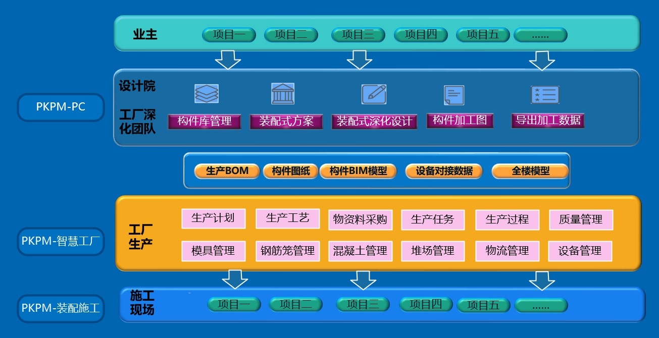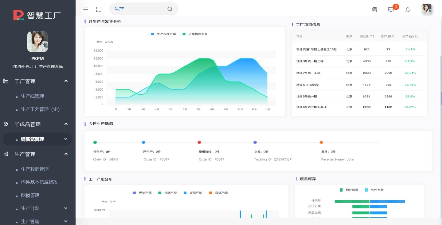PKPM装配式智慧工厂管理平台,集成了信息化、BIM、物联网、云计算和大数据技术,面向多构件工厂、多装配式项目,针对构件工厂全生产流程和装配式项目全生命周期进行管理,打通装配式项目的设计、生产、物流、施工等多个阶段,加强了管理的可视化和精细化,从而减少项目风险、降低构件成本、优化库存、提高工厂生产效率和应变能力、优化工厂管控流程、提高产品质量。